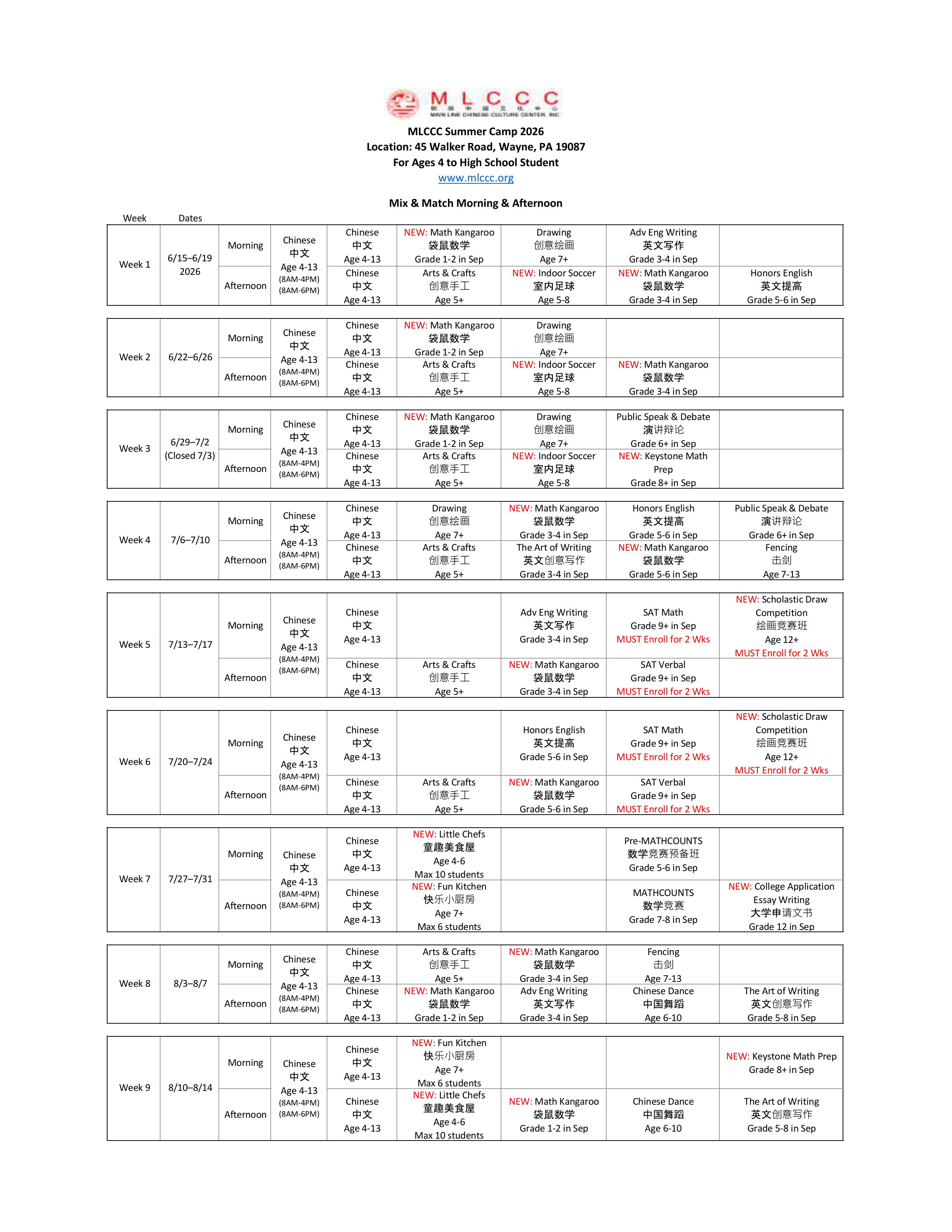 6/15 - 8/14, 9 Weeks, Register by week Chinese classes Enrichment/Intensive classes